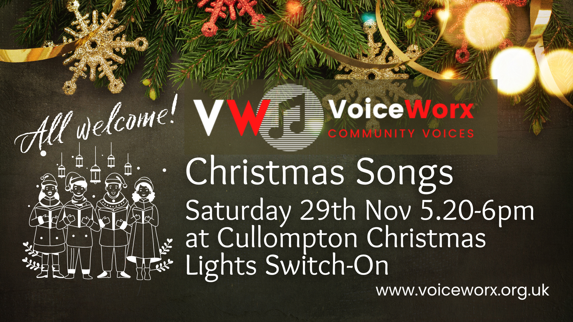 Type of event: Performance Start time: 5:00pm Venue: The Bull Ring, Cullompton Description: We'll be singing Christmas songs in the lead up to the lights switch on in Cullompton on 29th November. Singing from around 5.20 up to 6pm, with a song just after the lights for everyone to join in.